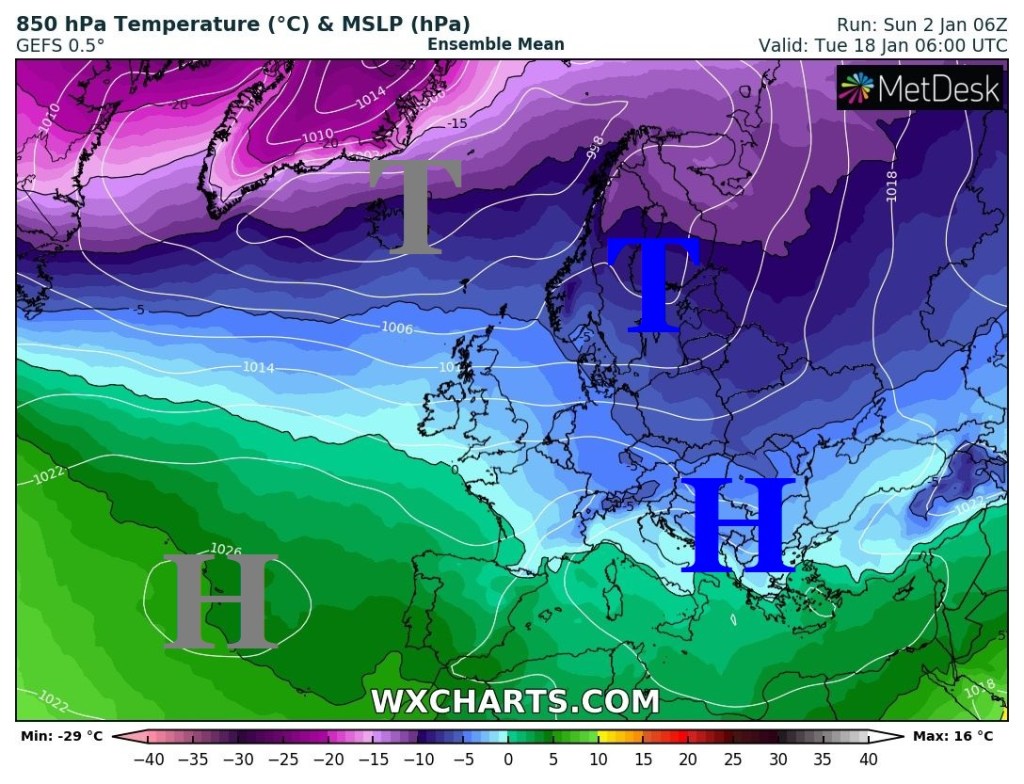 Bis zum 18. Januar bleibt uns das kühle Wetter weiter erhalten. Das Azorenhoch kehrt wieder zu seinen Wurzeln zurück und schickt ein Ableger-Hoch nach Südosteuropa. Island-Tief macht selbiges, das Randtief über Skandinavien bleibt ebenfalls dort und somit bleiben wir weiterhin in einer eher nordwestlichen Strömung mit immer wieder Regen, zahlreichen windigen Phasen und nur zwischenzeitlicher Chance für Sonne.