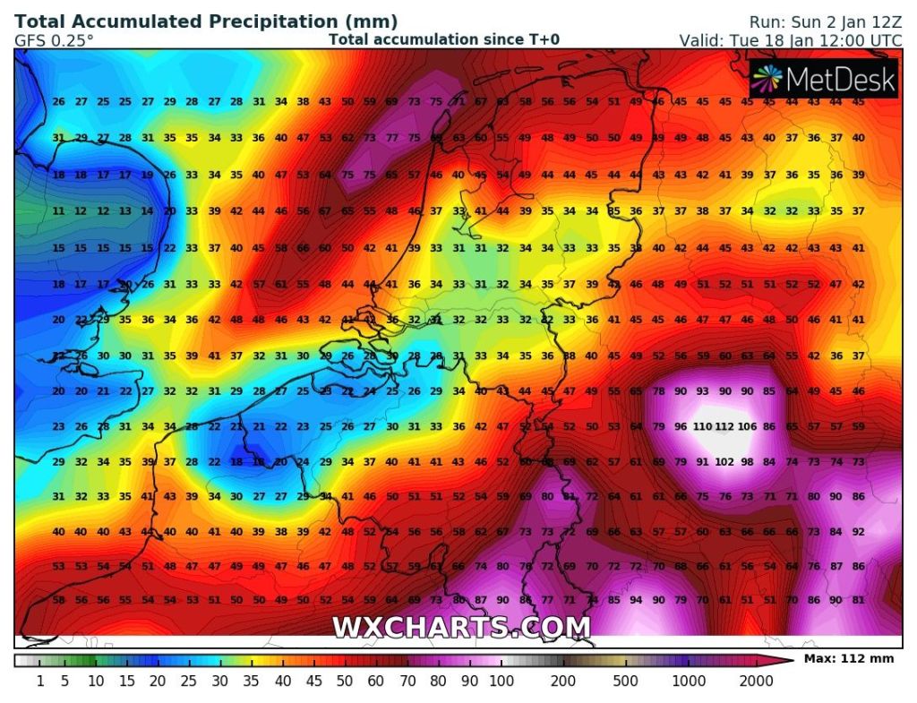 Dies erkennen wir auch ganz gut an den Niederschlagssummen für die kommenden 16 Tage. Zwar ist hier auch der Dienstag mit rund 15-20 Liter pro m² noch mit eingerechnet, aber alleine anhand der Nordseeregion können wir erkennen, wo die feuchte Luft mittelfristig herkommen wird. Eine trockene Phase ist also nicht in Sicht, die Temperaturen werden dabei aber eher seltener unter 0 °C wandern, womit die Niederschläge zumeist als Regen fallen werden.