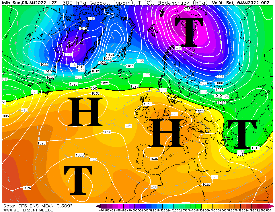 Deshalb brauchen wir im Prinzip gar nicht darüber spekulieren, ob aus dieser Großwetterlage eine Milde entstehen wird. Deswegen sehen wir auf dem Diagramm auch einen Abfall der Temperaturen in 1.500 Meter Höhe. Was nicht zwingend auch für die Temperaturen in Erdbodennähe bedeutet, Stichwort Inversion, was ich im selbigen Bericht von vorgestern beschrieben habe. Dann werden die Luftmassen wieder besser durchmischt, mit Wind steigen die Temperaturen wieder trotz kühlerer Luftmasse in 1.500 Meter Höhe. Die Frage ist nur, was aus dieser Großwetterlage entsteht. Denn das Hoch über dem Nordatlantik stellt die Wetterlage etwas auf den Kopf, woraus eine tiefwinterliche Wetterlage aus Nord entstehen könnte.