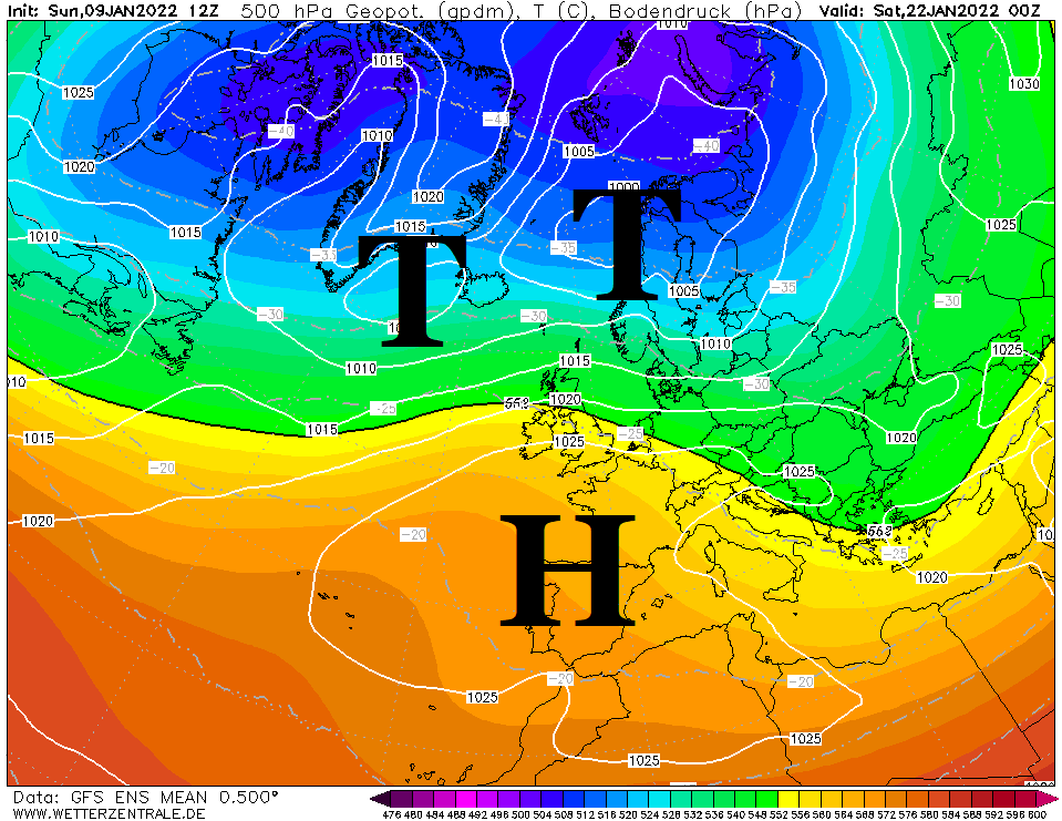 Nicht ganz, denn es gibt gewisse Nuancen, die dabei entscheidend werden können. Blicken wir erstmal auf die 552er, das ist die schwarze Linie, die von West nach Ost geht. Diese Linie spiegelt die Luftmassengrenze zwischen warmer Luft aus dem Süden und kalter Luft aus dem Norden wieder, hier verläuft auch der Jetstream, das Starkwindband in etwa 10 km Höhe. Am 15. Januar liegt dieser Jetstream noch nördlich von Deutschland, 7 Tage später bereits über uns. Wenn dieser Jetstream nun von Nordwest über uns läuft, dann spricht das über ein Grundwetterlage mit nordwestlicher Luftmassenherkunft, also kein Winter.