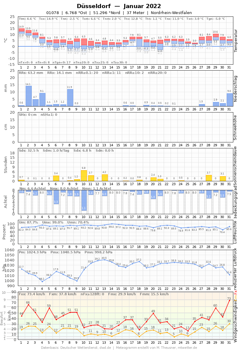 Die Niederschläge hingegen zeigen einen deutlichen Zusammenhang zu den Temperaturen. Man könnte fast meinen, dass je höher die Temperatur war, desto mehr Regen ist gefallen, gemittelt gesehen natürlich. So regnete es die ersten 9. Tage des Januars täglich, danach lange Zeit nicht bzw. nur sehr wenig. Erst als die Temperaturen wieder über 8,1 °C angestiegen sind, ist der Regen auch wieder nennenswert zu uns zurückgekehrt. 63,2 mm (Liter pro m²) stehen zu Buche, 94,5 % des langjährigen Mittels aus den Jahren 1961-1990 entspricht.