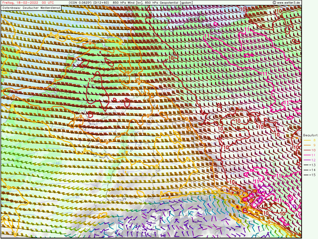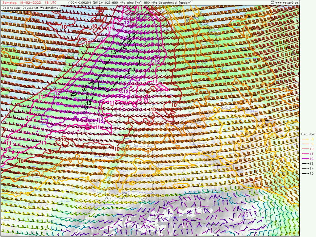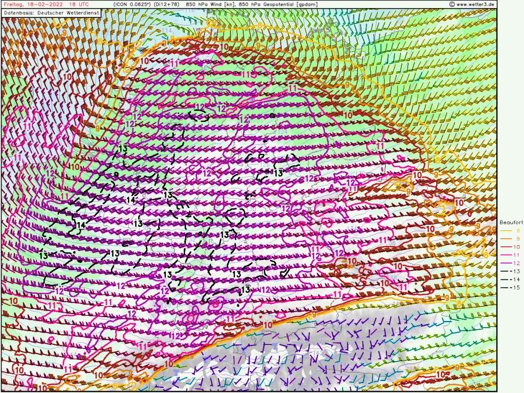 Dieses wird wohl nicht mehr die schweren Sturmböen produzieren mit Windstärke 12 in 1.500 Meter Höhe, aber hier wird es stundenlang Windböen über 70 km/h geben.