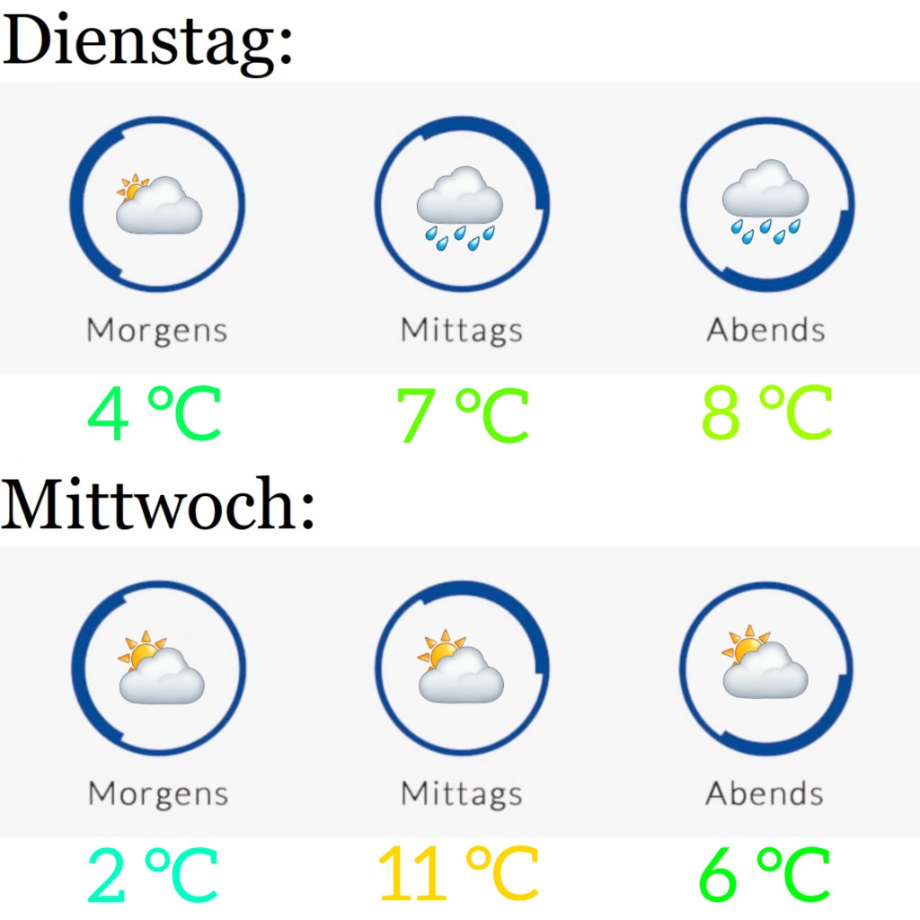 Nun ja, Wetter. Zwar gibt es auch morgen wieder Regen und Wind, aber nichts mehr in Richtung Sturm. Die stärksten Böen erreichen in den Abendstunden bis 55 km/h. Am Mittwoch beruhigt sich das Wetter endlich und es wird zudem auch relativ mild.