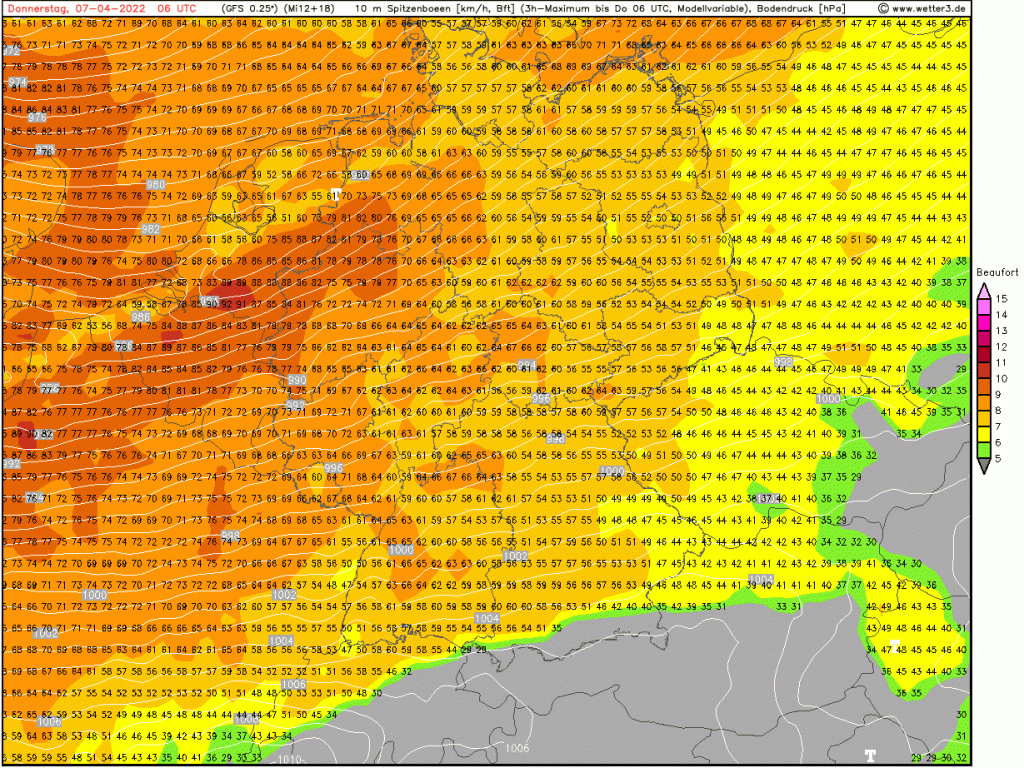 Nach diesem Modell dürften die Windspitzen bis zum Vormittag auf etwa 85 km/h nach oben schnellen, ehe sie relativ zügig wieder zurückgehen werden. An der Kaltfront selbst, die uns gegen 12 Uhr überqueren dürfte, sind dann auch Böen bis 95 km/h möglich. Das in Begleitung von teils kräftigem Regen. Eine allen in allem sehr unangenehme Angelegenheit, wenn auch die Temperaturen zuvor mit bis zu 14 °C recht angenehm sind. Im Vorfeld gibt es einzelne Schauer, nachfolgend gibt es weitere teils kräftige Wind mit stürmischen Böen. Graupel, Hagel und Blitz & Donner sind ebenfalls möglich.