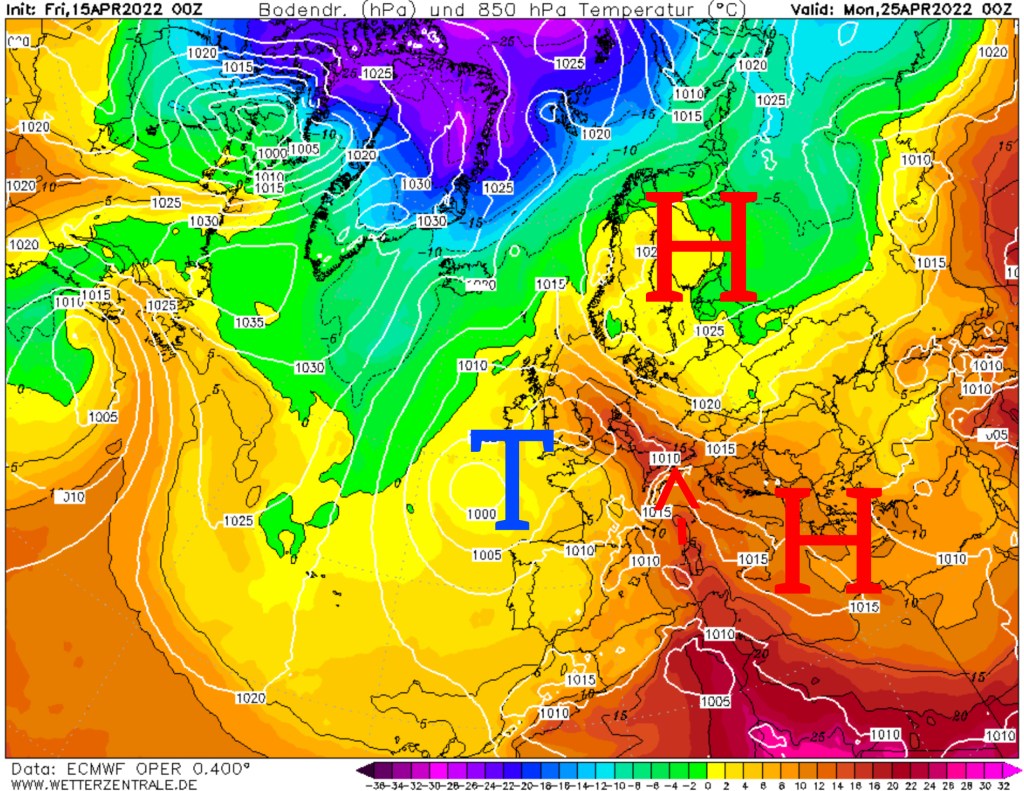 Und genau diese Wetterlage steckt dahinter. Ein Hochblock über Osteuropa, ein Tief vor der Biscaya und somit entsteht ein Warmluftvorstoß aus dem nordafrikanischen Sahara-Raum zu uns. Wärmer geht es dann nicht mehr für die Jahreszeit.