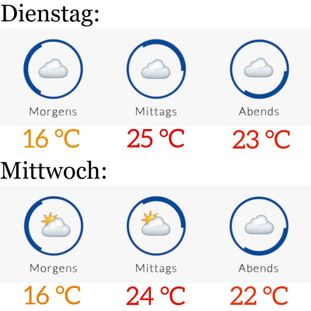 Die Prognose für die kommenden zwei Tagen sieht etwas düsterer aus, als es jetzt vermutlich kommen wird. Gerade morgen dominieren hohe Wolkenfelder, die Sonne wird nur sporadisch, vermutlich zum Vormittag, mal durchblicken. Am Mittwoch setzt sich häufiger die Sonne durch, es ist teils windig und frühsommerlich warm.