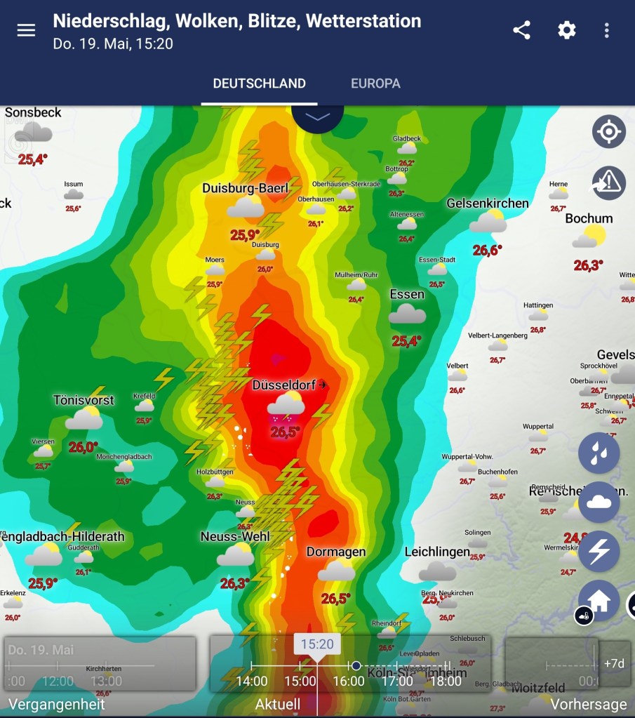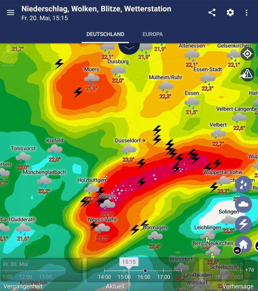 Die größte Unwettergefahr scheint sich zwischen 16-17 Uhr zu entwickeln. Hier können dann extremer Starkregen (bis zu 70 Liter pro m² binnen einer Stunde), orkanartige Böen (100 km/h) sowie Hagelschlag dabei sein. Das sind die stärksten Auswüchse dieser Gewitterfront, der Schwerpunkt scheint sich aktuell zwischen dem Niederrhein rund um Kleve bis in das südliche Ruhrgebiet zu erstrecken. Wir sind genau an der Grenze dazu, weshalb eine leicht südlichere Zugbahn automatisch mit uns kreuzen würde.