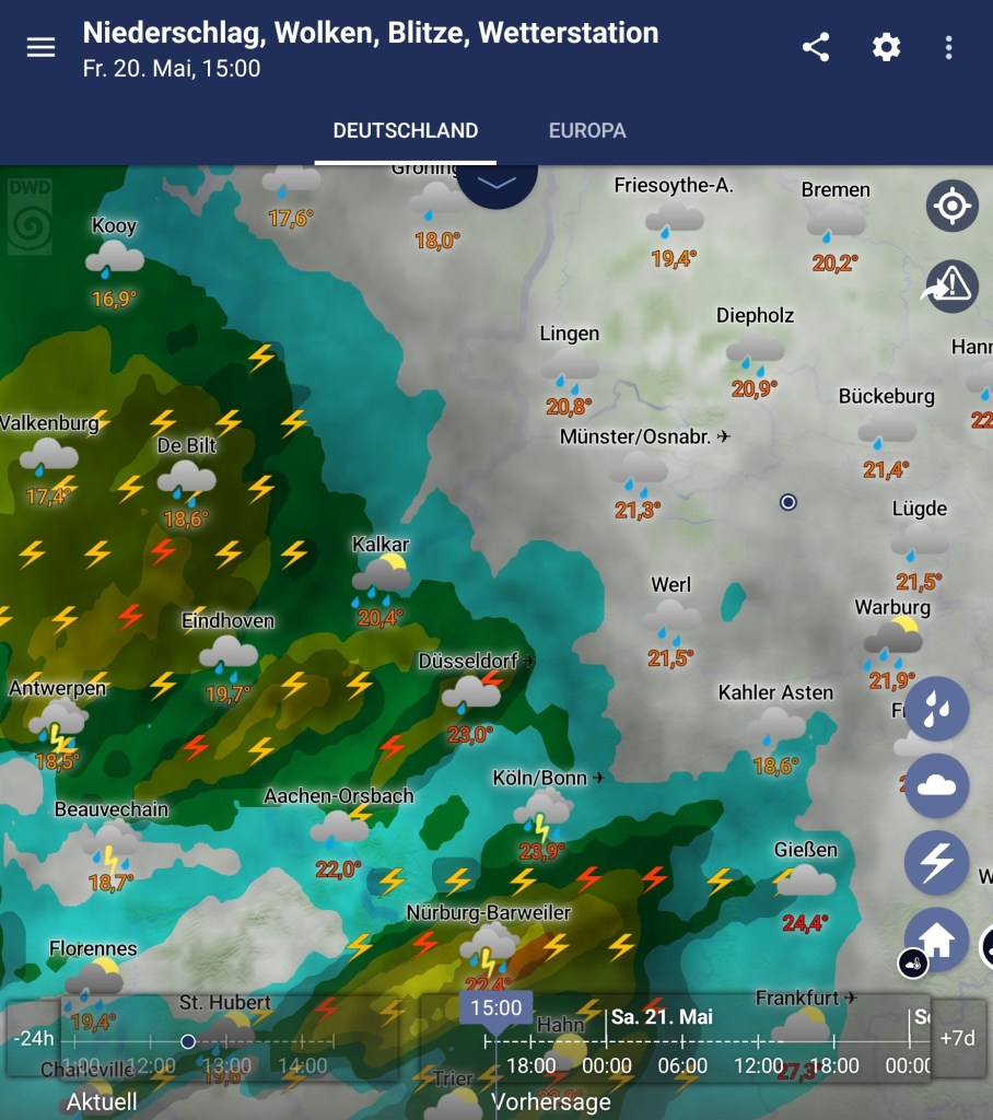 Gewitterfront liegt jetzt genau über uns. Vielerorts Starkregen von 10-15 Minuten, dazu örtlich etwas Hagel. Viele Blitze sind dabei, die aber vermutlich eher in den Wolken bleiben werden, damit allgemeines Grummeln zu hören. Sturmböen wahrscheinlich anhand der Daten aus Aachen und Mönchengladbach.