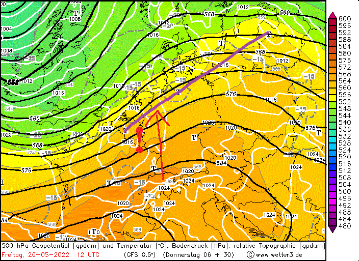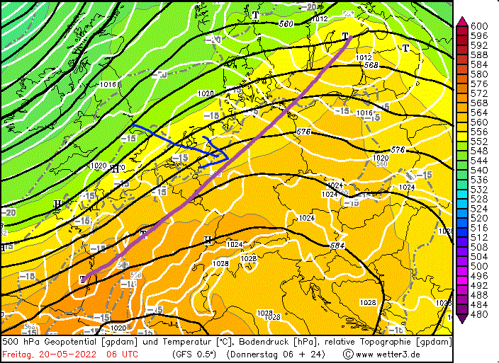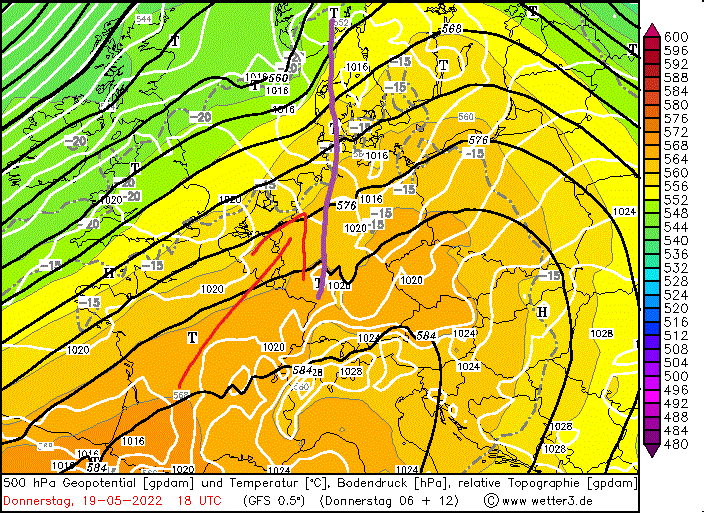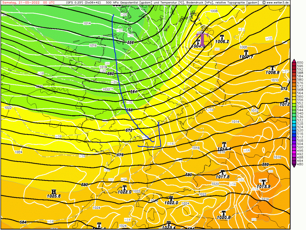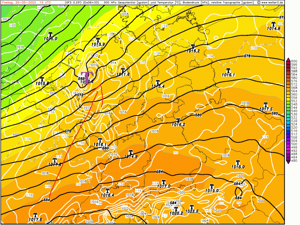 Das Tief zieht folglich weiter nach Ost und es rückt kühlere Luft aus Nordwest an. Hier wird es in einem weiteren Aspekt gefährlich, weil nun eine Windscherung entsteht. Während die Isobaren in Erdbodennähe (Linien gleichen Luftdrucks in weiß) drehen und somit auch der Wind auf Nordwest dreht, sind die Isobaren in 5.500 Meter Höhe (Linien gleichen Luftdrucks in schwarz) nach wie vor in nordöstlicher Richtung unterwegs. In verschiedenen Stockwerken kann die Luft beginnen zu zirkulieren und das erhöht das Risiko vor Tornados. Für das Wetter konkret bedeutet das, dass die Schauer und Gewitter vermutlich gegen 19 Uhr durch sein werden. Danach folgt ein Mix aus Sonne und Wolken, der Wind ist mit 35 km/h in Böen weiter lebhaft und die Temperaturen sind mit 17 °C deutlich zurückgegangen.