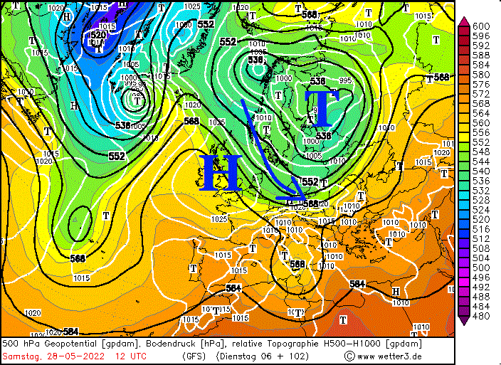 Dann folgt das Wochenende und wir sehen ein Tief über der Ostsee, welches zusammen mit einem Hoch über den britischen Inseln kühle Luft aus dem Norden zu uns lenkt. Diese ist zwar auch ziemlich feucht, aber die Luftmasse in der Höhe (5.500 Meter Höhe) ist bei uns noch eine Spur stabiler, weswegen in unserer Region kaum Schauer entstehen werden. Hier leistet das Hoch noch ganze Arbeit. Kühler wird es dennoch, da die Temperaturen auf 0-2 °C in 1.500 Meter Höhe zurückgehen, womit wir je nach Sonneneinstrahlung maximal 14-18 °C erreichen dürften. Damit ist natürlich auch jegliche Unwettergefahr vorbei, durch die Isobarendrängung (Isobaren = Linien gleichen Luftdrucks) ist es aber weiterhin ziemlich windig.