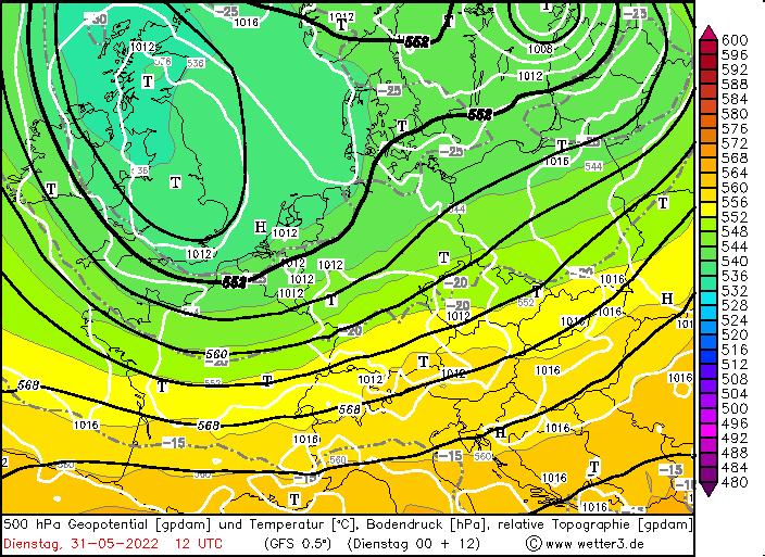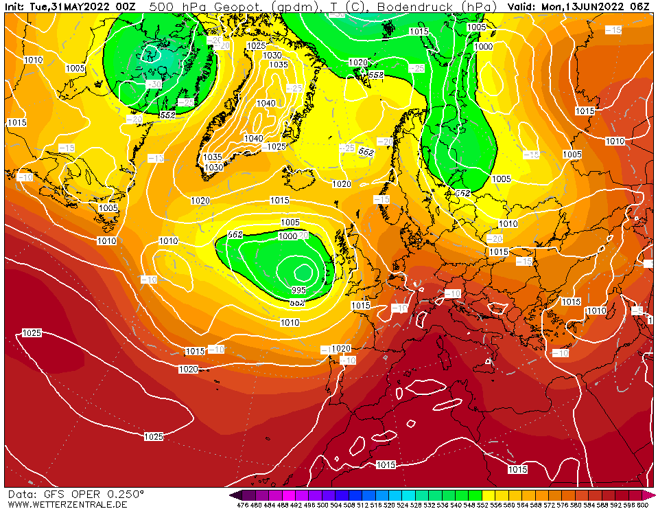 Es wird weiterhin an einem Vorstoß der nordafrikanischen Hitze in Richtung Mittelmeerraum gearbeitet. Insbesondere der Hochdruck in 5.500 Meter Höhe schiebt sich bin an die französischen Mittelmeerküste und versucht sich dabei auch bis an die Alpen vorzudrängen. Wir in Westdeutschland liegen dabei am Rande diesem Hochdruckgebiets, von Westen her drängt sich ein Tief dazwischen und versucht sich dagegen zu stämmen, folglich wären Schauer und Gewitter in schwülwarmer Luft.