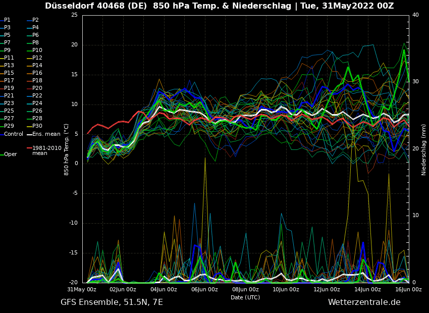 Mit Blick auf das Ensemble sehen wir in Richtung 13. Juni den Hauptlauf, der ordentlich nach oben ausbüchst und damit zu einem der extremeren Läufe zählt. Dieser berechnet bis 31-34 °C (je nach Sonnenscheindauer) und ein Gewitterrisiko am Abend. Rund um diesen Zeitraum gehen zwar mehrere Läufe mit den Temperaturen deutlich nach oben, es gehen aber auch einige Läufe den kühleren Weg, mit entsprechenden Niederschlagssignalen. Kurzzeitige Hitze ist also für den Zeitraum um den 13. Juni durchaus möglich, so richtig heiß, beständig und trocken ist hingegen recht unwahrscheinlich.