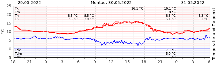 Am gestrigen Montag wurde es wieder etwas milder. Zwar war es mit 11,8 °C im Mittel immer noch relativ kühl, aber wir bewegen uns langsam wieder in Richtung langjähriges Mittel. Für einen 30. Mai waren wir gut 4 °C kühler als die letzten 30 Jahre. Interessant an der Temperatur- und Taupunktkurve sind außerdem die kleinen Zacken zwischen 6-20 Uhr. Hier zeigt sich ganz eindrucksvoll die zwischenzeitliche Power der Sonne.