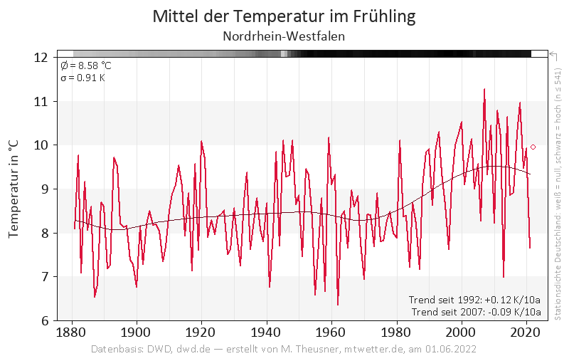Mit 11,1 °C lagen wir in Düsseldorf über dem langjährigen Mittel aus 30 Jahren (1961-1990), wenig überraschend. 1,6 °C wärmer war es im Vergleich, was gerade auch durch den Mai nochmal ordentlich nach oben gepusht worden ist. Besonders interessant in dem Zusammenhang ist die hohe Anzahl der Luft- und Bodenfrosttage mit 11 und 29. Noch einigermaßen gut weggekommen ist Düsseldorf in Sachen Niederschlag. 134,2 Liter pro m² wurden in den abgelaufenen 3 Monaten gemessen, was 72,7 % des langjährigen Mittels entspricht. Zum Vergleich: In Tönisvorst sind 54,8 % gefallen, auch Duisburg ist mit 58,4 % verhältnismäßig trocken, wo hingegen Hattingen mit 110,4 % voll im Soll lag. Weniger Abweichung untereinander zeigen uns die Sonnenstunden. In Düsseldorf gab es 694,5 Sonnenstunden, was 151 % dem langjährigen Mittel entspricht. Über ausreichend Sonne konnten wir uns nicht beschweren, die Natur hingegen schon etwas mehr.