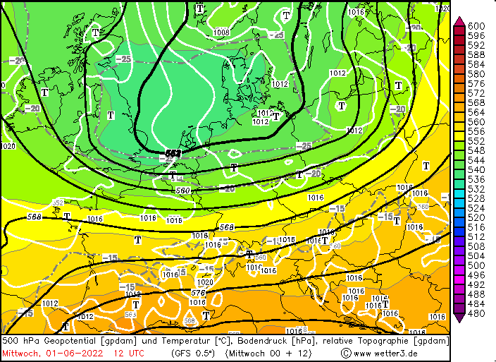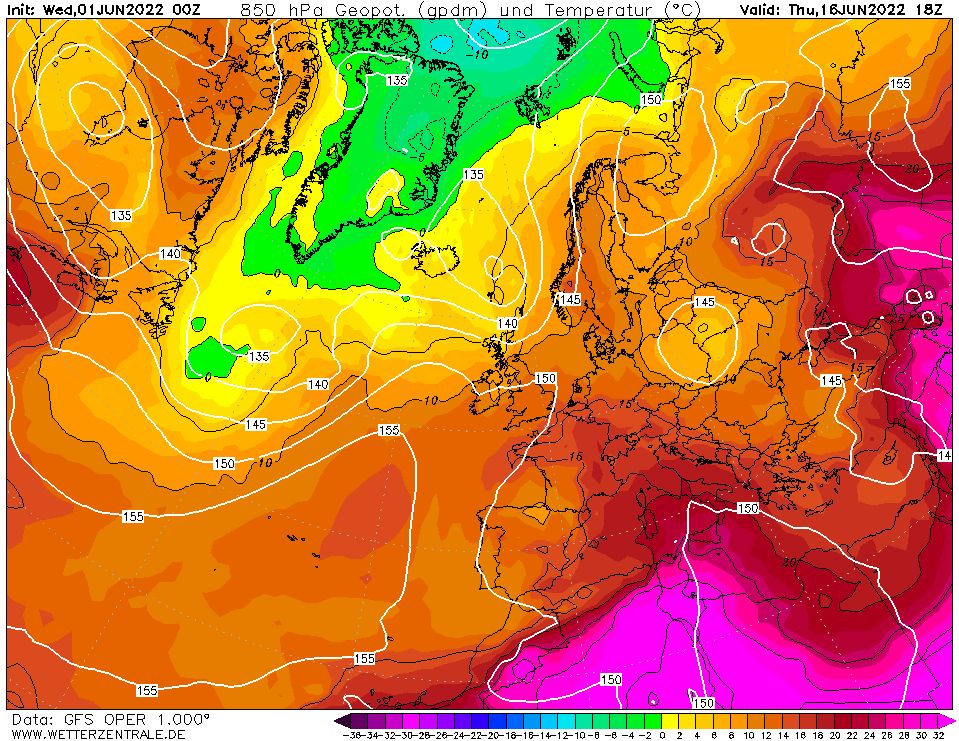 Wir halten weiterhin Ausschau auf einen möglichen Hitzevorstoß in Richtung Mitte Juni. Diese Berechnung vom Hauptlauf um 0 Uhr ist dafür etwas exemplarisch, da wir weiterhin ein Tief über der Biskaya berechnet haben, welches die Südströmung über Mittel und Südeuropa so richtig in Gang bringt. Gestützt wird dies von einem Hoch über dem Mittelmeer, das Tief über dem 3-Länder-Eck von Belarus, Ukraine und Polen ist hingegen interessant. Schauer und Gewitter mit Unwettergefahr wären vorprogrammiert. Das Hoch über Nordrussland hingegen lenkt alle Tiefs vom Atlantik nach Norden weiter und somit weit weg von uns.