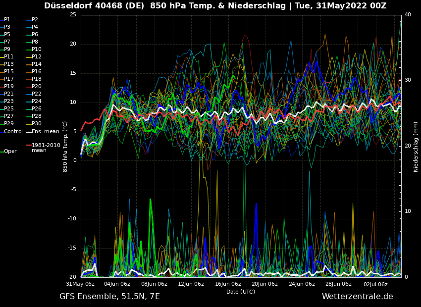 Und zum Schluss noch eine kleine Bemerkung meinerseits. Ich lese mittlerweile des Öfteren, dass zu Pfingsten teils schwere Unwetter drohen. Diese sehe ich in den Modellberechnungen auch, ABER: Düsseldorf scheint davon aktuell nicht wirklich betroffen zu sein.