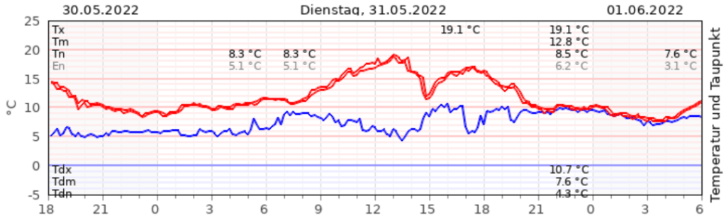 Am gestrigen Dienstag erlebten wir einen zweigeteilten Tag. Während der Morgen noch ziemlich bedeckt war, bekamen die Wolken im Tagesverlauf immer wieder Lücken und die Temperaturen stiegen folglich auf bis zu 19,1 °C an. Mit 12,8 °C im Tagesmittel war es aber weiterhin kühler als das, was der 31. Mai die grob letzten 30 Jahre so zu bieten hatte. Die beiden Schauer sind ebenfalls gut zu sehen, der Schauer gegen 17 Uhr brachte zudem 53,7 km/h in Böen. Mit dem Schauer gegen 22 Uhr kamen insgesamt 4,7 Liter pro m² zusammen.