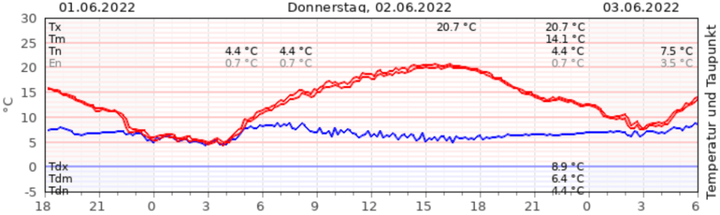Der gestrige Donnerstag zeigte sich schon mal so richtig freundlich. So stiegen die Temperaturen im Tagesverlauf wieder über die 20 °C Marke an, mit knapp 12,5 Sonnenstunden war es zudem äußerst sonnig. Mit 14,1 °C lagen wir zwar nach wie vor gut 1 °C unter dem langjährigen Mittel, die Temperaturen berappeln sich aber nun immer mehr und wir bewegen uns nun mit großen Schritten in Richtung Sommercomeback.