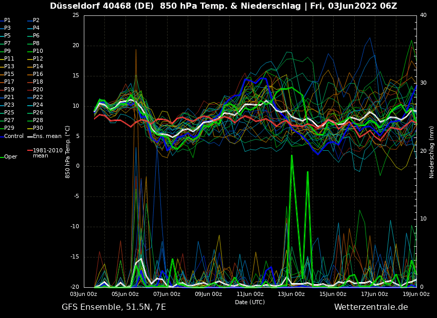 Nach den heutigen Berechnungen ist nach wie vor der 13. Juni der Tag mit den wohl höchsten Temperaturen, was die Luftmasse angeht. Mit an die 15 °C in 1.500 Meter Höhe bewegen wir uns in Richtung 30 °C-Marke zu. Dass in dieser Luftmasse ordentlich Power drin sein kann, sehen wir gleich im Ensemble. Zuvor noch eine kleine Bemerkung: Der Hauptlauf bastelt nicht nur unaufhörlich an einem kurzen Hitzepeak, auch die Phase, in der die Temperaturen überdurchschnittlich ansteigen werden, vergrößert sich vom 10.-14. Juni.