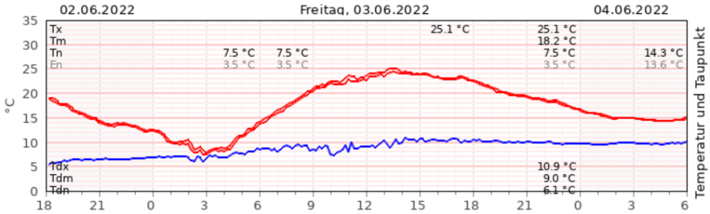 Mit Start in das erste Sommerwochenende stiegen die Temperaturen gestern auch erstmal wieder über die 25 °C-Marke. Mit 18,2 °C war es zudem der erste Tag seit gut einer Woche, an dem die Temperaturen über dem langjährigen Mittel aus den vergangenen 30 Jahren lagen (+1,8 °C). Hinzu kamen 10:20 Sonnenstunden, wobei diese zum Großteil in der ersten Tageshälfte vernommen werden konnten.