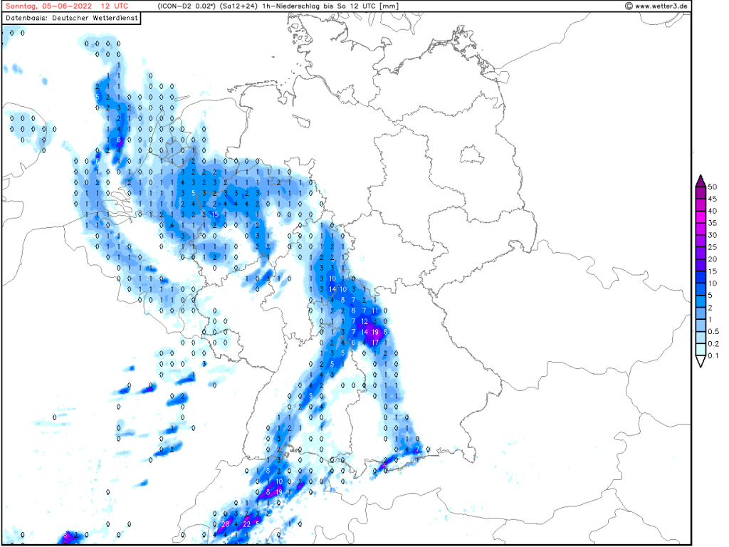 Ich gehe davon aus, dass der morgige Regen uns so gegen 11 Uhr erreichen wir uns sich von dort an ergiebig intensiviert. Schwerpunkt dann bis 14 Uhr mit teils 3-6 Liter pro m² in einer Stunde, die Niederschlagssumme im Bild oben gehen auf bis zu 15 Liter pro m² (örtlich begrenzt). Der Regen zieht dann nach Norden hin gegen 16 Uhr ab und es folgt noch eine Gewitterlinie, die uns nicht vor 20 Uhr erreichen dürfte (wenn sie bis zu uns durchhält). Der Montag ist dann schon wieder ruhiger.