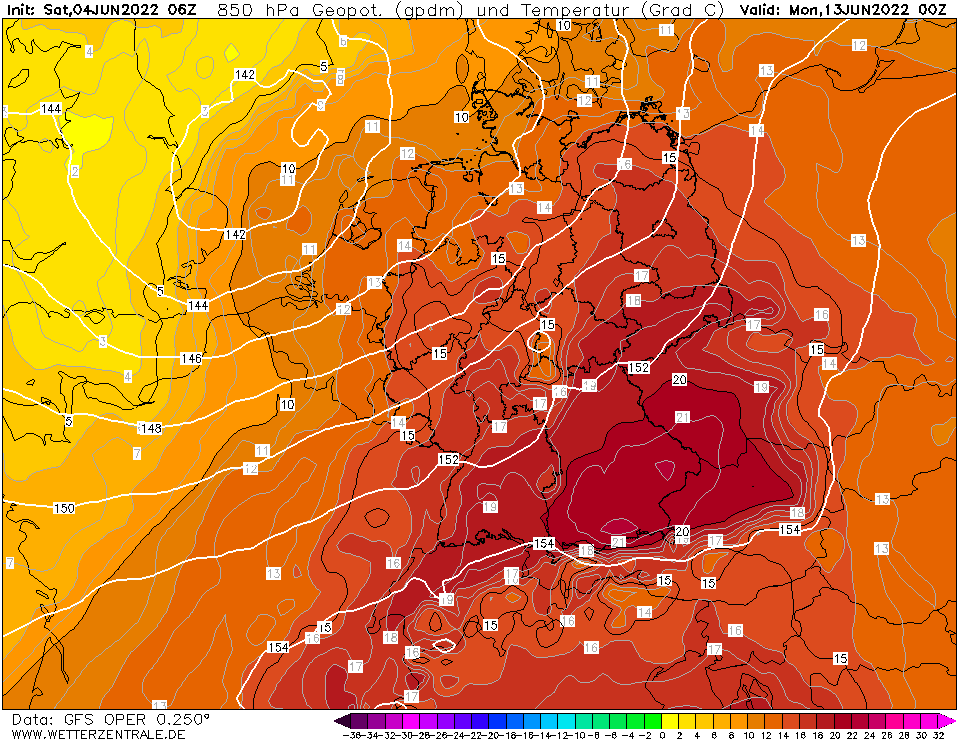 Am Ende der kommenden 7 Tage, die nach einer kurzen Kältephase wieder sommerlich werden dürften (sehen wir gleich noch anhand des Ensembles), könnte sich abermals eine Unwetterlage entwickeln. Die Temperaturen kommen mit einem Tief nochmal richtig in Schwung und erreichen bei uns um die 15 °C in 1.500 Meter Höhe, womit gut und gerne 27-29 °C drin sein werden. Keine optimale Sonneneinstrahlung, deshalb nicht mehr. Da diese heiße Luft direkt wieder von kalter Luft (Temperatursturz von 10 °C) beiseite geräumt wird, wird dies nicht ohne Zwischengeräusche vonstatten gehen. Damit beschäftigen wir uns aber erst zur gegebenen Zeit.