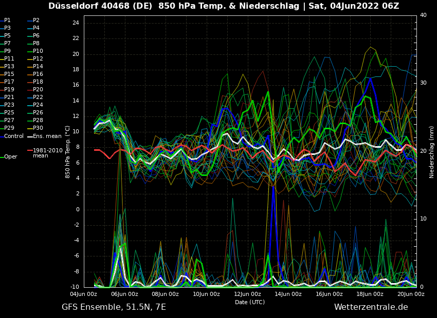 Danach berappeln sich die Temperaturen zum nächsten Wochenende wieder, wobei hier Haupt- und Kontrolllauf deutlich milder als viele Modelle sind. Dazu auch deutlich trockener, was eine kurze Hitzephase mit trockenem Wetter gar nicht von der Mehrzahl der Modellberechnung abgebildet wird. Das auf und ab der Temperaturen mit immer wieder konvektivem Niederschlag (örtlicher Niederschlag in Form von Schauern und Gewittern) dürfte uns auch noch etwas weiter in den Juni hinein begleiten.