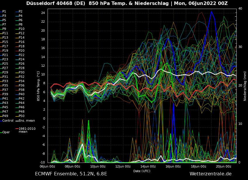 Und wie unsicher diese Wetterlage tatsächlich ist, sehen wir besonders am Ensemble. Hier geht beispielsweise der Hauptlauf (grün) zum 11. Juni wieder deutlich nach oben, stürzt relativ schnell wieder ab, um dann zum 17. Juni einen neuen Anlauf mit Hitze zu starten, ehe er dann erneut 2 Tage später wieder abstürzt. Dazu sind die Niederschlagssignale recht gering, was allerdings in so ziemlich allen Modellberechnungen deutlich nach unten gerechnet worden ist im Vergleich zu den vergangenen Tagen. Der Kontrolllauf (blau) tut es dem Hauptlauf ziemlich gleich, wenn auch zeitlich leicht versetzt und mit tendenziell leicht mehr Niederschlag.