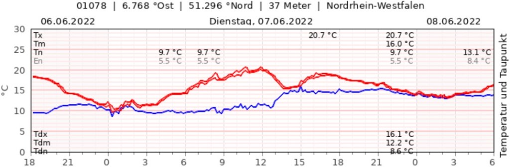 Der gestrige Tag lieferte uns ebenso schon etwas Regen. Mit rund 1,4 Liter pro m² gab es schon einmal etwas für die Natur. Diesen Schauer können wir auch zeitlich ganz gut in der Temperaturkurve einordnen mit 15 Uhr (in der Grafik also 13 UTC). Mit 16,0 °C gehen die Temperaturen aktuell sukzessive zurück und lagen damit ganz knapp unter dem langjährigen Mittel aus 30 Jahren für einen 7. Juni (-0,2 °C).