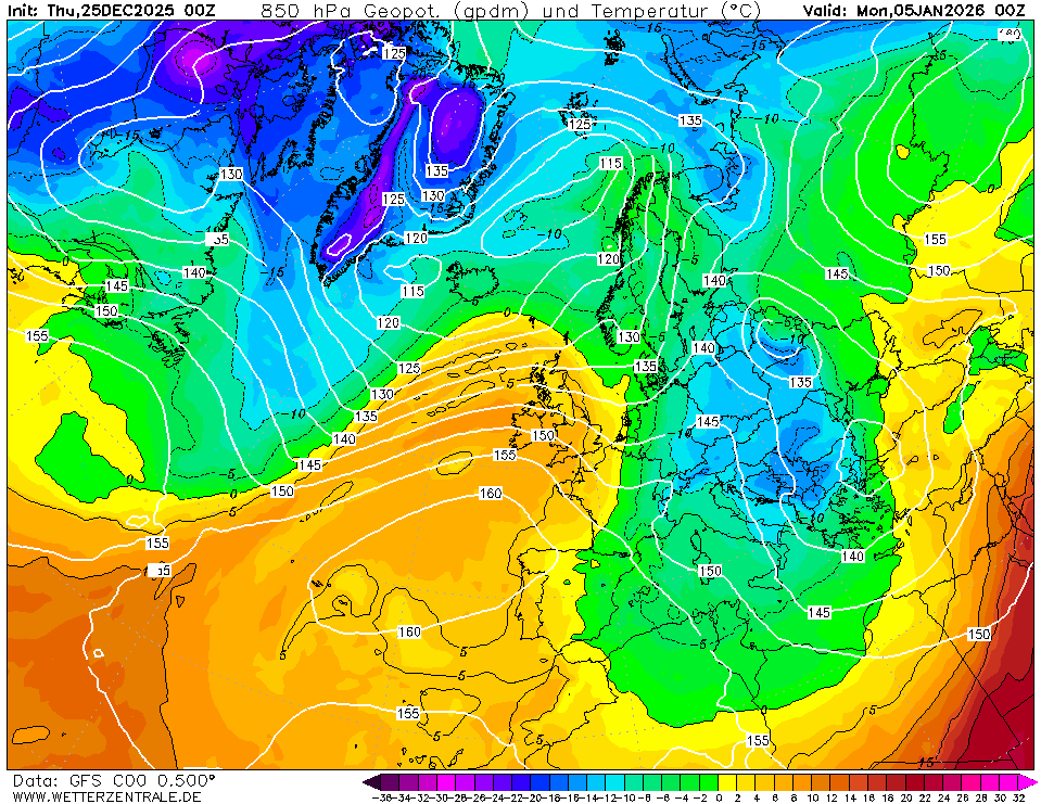 Oben seht ihr die Prognosen der Modellberechnungen für die Luftmassentemperaturen in 1.500 Meter Höhe.