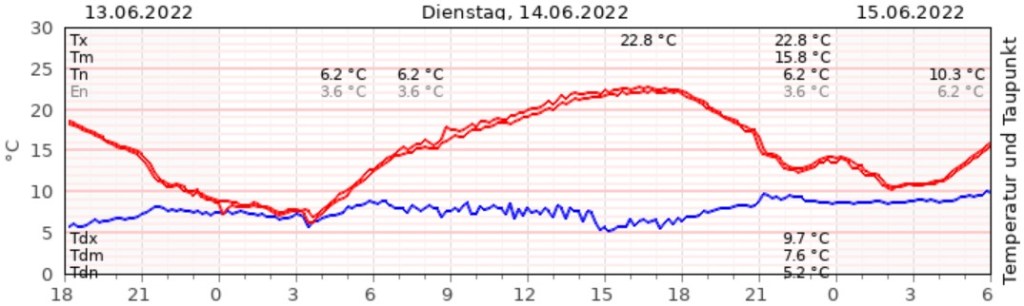 Der gestrige Dienstag hat schon mal so langsam auf das eingestimmt, was uns nun in den kommenden Tagen erwarten wird. Viel Sonne, trockene Luft und „hohe Temperaturen“. Dazu eine hohe Sonnenbrand- und Sonnenstichgefahr. Mit 15,8 °C lagen wir unter dem langjährigen Mittel aus 30 Jahren für einen 14. Juni (-1,5 °C), maximal stiegen die Temperaturen auf 22,8 °C an. Dazu gab es knapp 15 Sonnenstunden.