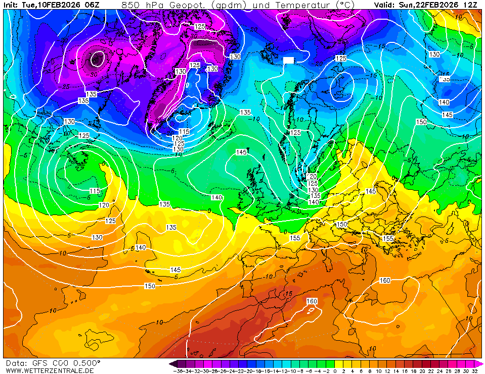Oben seht ihr die Prognosen der Modellberechnungen für die Luftmassentemperaturen in 1.500 Meter Höhe.