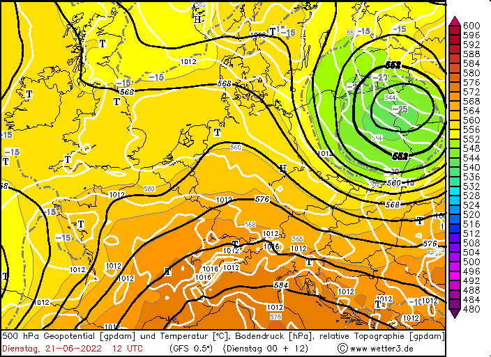 Nicht nur, dass heute kalendarischer Sommeranfang und somit auch die Sommersonnenwende ist, kehren auch die sommerlichen Temperaturen zurück. Das Höhentief hat sich in Richtung Osteuropa zurückgezogen und wir gelangen nun in die stabilere und deutlich wärmere Luft. „Beeindruckend“ ist in dem Zusammenhang, dass sich die Luftebene in 5.500 Meter Höhe um gut 200 Meter auf 5.700 Meter Höhe angehoben hat, was für eine stabile Luft spricht.