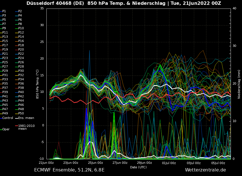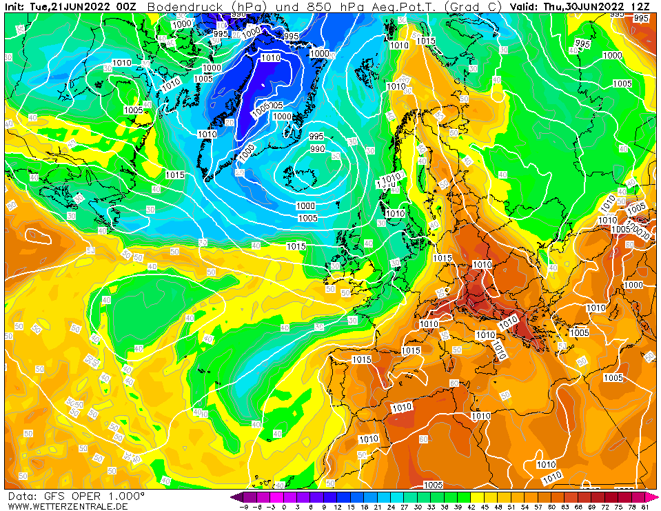 Und mit dieser Karte lässt sich im Sommer immer sehr gut ermitteln, wo genau Hitze / Kälte liegt und ob diese Luftmasse entsprechend feucht ist. So gibt es einen ziemlich heißen und feuchten Bereich vom Mittelmeer über Alpenraum und Balkan in Richtung Baltikum. Im Nordwesten liegt hingegen die kühle Luft, die sich bis zur Bretagne und Norwegen erstreckt. Wir liegen im Grunde genommen genau dazwischen, wenn auch sich diese Linie zwischen kühl-feuchter Luft und heiß-feuchter Luft immer etwas hin und her verschiebt. Die Großwetterlage zum 30. Juni ist deshalb interessant, weil ich in den darauffolgenden 5-6 Tagen kaum etwas an der Konstellation ändert. Siebenschläfer?