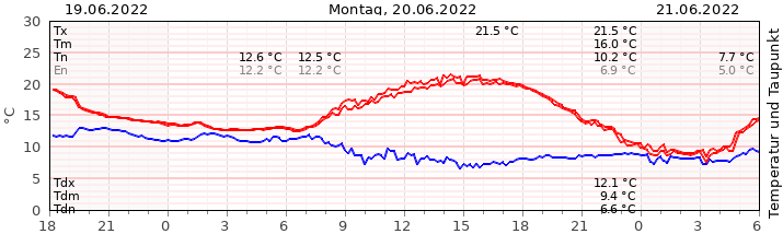 Mit 16,0 °C starteten wir verhalten in die neue Woche. Im Laufe der Nacht und des Morgens fiel etwas Regen, womit 4,0 Liter pro m² zusammen kamen. Anschließend bekamen die Wolken immer mehr Lücken, ehe der Himmel zum Abend hin auch wolkenlos wurde. Dazu war die Luft äußerst trocken und somit recht angenehm. Maximal wurden 21,5 °C, mit der Mitteltemperatur lagen wir gut 1,7 °C unter dem Mittel aus 30 Jahren für einen 20. Juni.