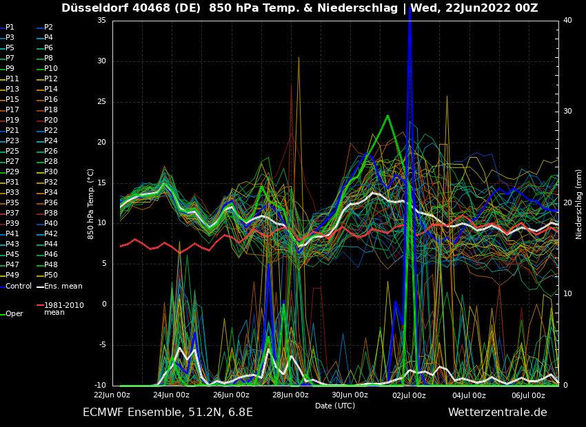 Das europäische Modell sieht das im Prinzip ähnlich, außer dass sowohl Niederschläge als auch die Auswüchse nach oben hin deutlich höher gehen, was die Temperaturen betrifft. Hier wird ebenfalls der neue Wärmeberg rund um den 30. Juni berechnet, wobei hier der Hauptlauf mit 23 °C (38 °C am Erdboden) völlig aus der Reihe tanzt. Wir hatten ja am Montag mal davon gesprochen, dass so eine Art Grenzlage berechnet wird, wo wir westlich eher unter Tiefdruckeinfluss mit Schauern und Gewittern liegen und östlich die Hitze liegt. Bei diesem Lauf wird diese Hitze eben über uns berechnet, was ich derzeit als äußerst unwahrscheinlich erachte.
