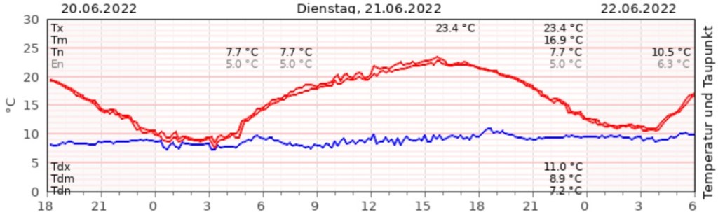 Ein alles in allem recht „unspektakulärer“ Dienstag. Der kalendarische Sommeranfang lieferte uns ein Tagesmittel von 16,9 °C, mit dem wir gut 1 °C unter dem langjährigen Mittel aus 30 Jahren für einen 21. Juni lagen. Mit maximal 23,4 °C wurde es kein Sommertag, hinzu kamen zahlreiche hohe Wolkenfelder, die das allgemeine Empfinden etwas getrübt haben. Dazu war der Wind sehr ruhig.