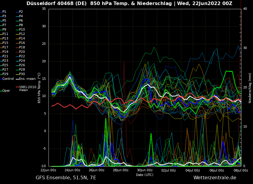 Und genau so viel Durchschnitt wird auch im Ensemble abgelichtet. Nach dem kurzen Wärmeberg in den kommenden Tagen gehen die Temperaturen sukzessive wieder zurück, in stetiger Begleitung von Niederschlag. Dann schaut es nochmal nach einer neuen Wärmephase mit trockenem Wetter rund um den 30. Juni aus, ehe dann wieder kühlere Temperaturen und Schauer an der Tagesordnung stehen. Und das dann mindestens bis zum 8. Juli.