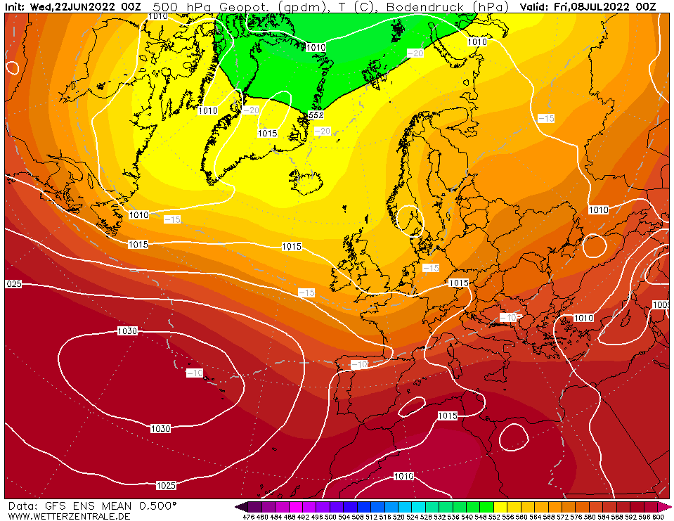 Wir springen heute mal ans Ende des Vorhersagezeitraums, aus einem bestimmten Grund. Diese Wetterlage ist nahezu identisch mit der Wetterlage, die auch 10 Tage zuvor bereits berechnet wird. Zumindest, wenn man sich das Mittel aller Modellberechnungen des amerikanischen GFS anschaut. Da wäre zum einen das kräftige Azorenhoch, ein Tiefdruckkeil bis nach Nordspanien hinein und ein Hoch über Osteuropa. Alles klassisch gemäßigtes Sommerwetter mit kurzen warmen Phasen, die dann von Schauer und Gewittern wieder verdrängt werden. Das können wir unter anderem sehr gut an der -15 °C Isotherme (Linien gleicher Temperatur) in 5.500 Meter Höhe erkennen, die genau über uns liegt und somit die Schauerzonen nach Nordnordwest hin ganz gut kennzeichnet. Die kühle Luft hat sich weit in den Norden zurückgezogen, die Hitze lungert über dem Mittelmeerraum herum.