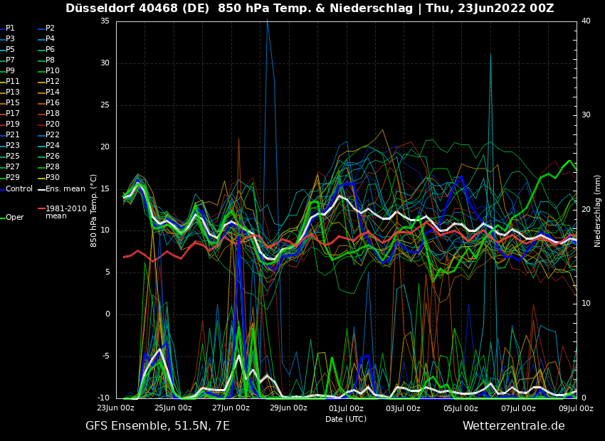 Entsprechend möchte auch das amerikanische GFS nichts davon wissen. Wir sehen die kommenden Tage ganz gut eingebettet in das, was wir oben bereits besprochen haben. Ein auf und ab mit den Temperaturen, immer wieder Schauer und Gewitter sowie ein mittelfristiger Rückgang der Temperaturen. Zum Monatswechsel sollen die Temperaturen dann wieder ansteigen (Stichwort: Omegalage), ehe wir uns dann zurück in Richtung Durchschnitt bewegen. Und da das Omegahoch soweit nordöstlich liegt, bleiben wir im Einfluss von Schauerwetter. Hitzewelle somit weiterhin unwahrscheinlich.