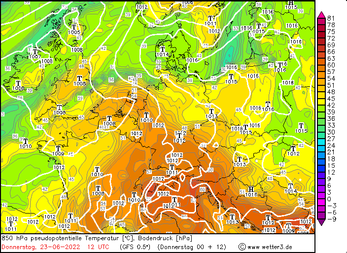 Anhand der pseudopotentiellen Temperatur können wir erkennen, wie trocken / kalt bzw. feucht / heiß eine Luftmasse ist. Je höher der Wert, desto wärmer und feuchter ist die Luft, umgekehrt natürlich je niedriger der Wert, desto kühler und trockener ist die Luft.
