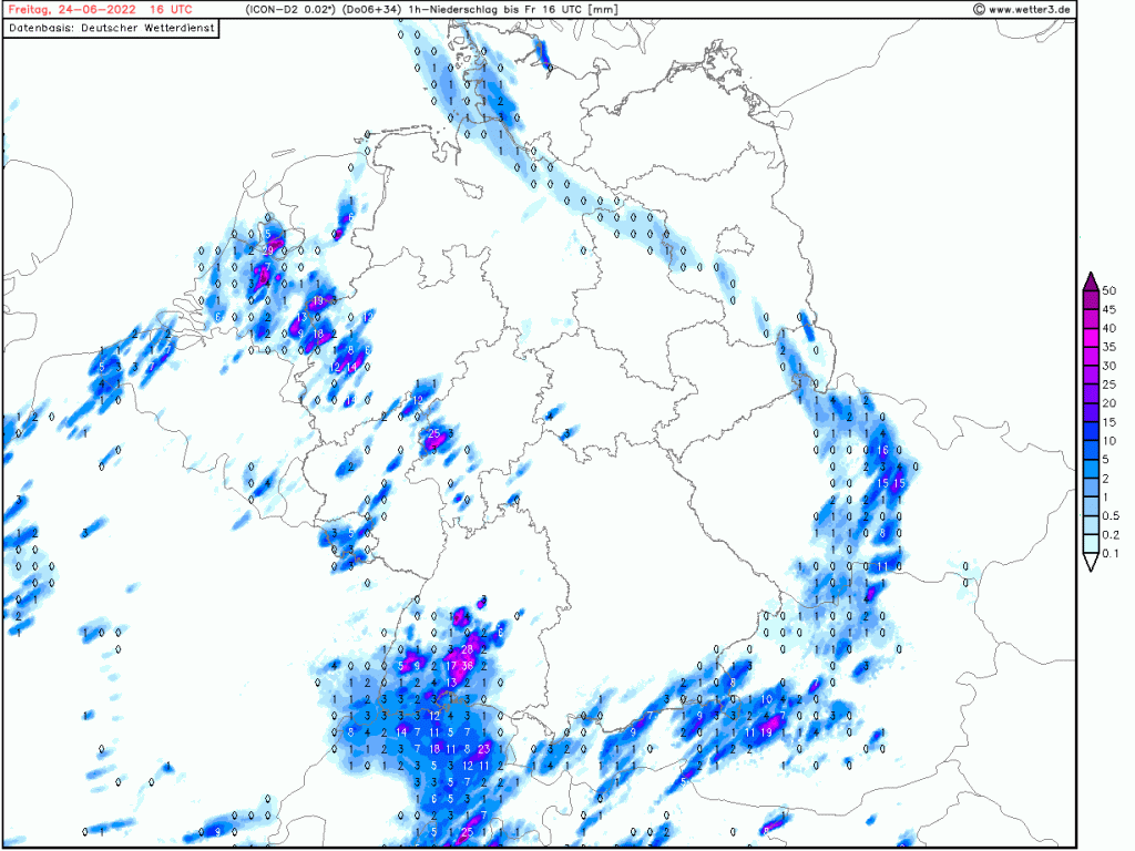 Sobald diese Kaltfront durch ist, lockert der Himmel nach und nach wieder auf, bis zum Nachmittag und frühen Abend weitere Schauer und Gewitter aufziehen. Diese sind dann abermals in der Lage Starkregen zu bringen. Auch hier ziehen wir das ICON-D2 heran, welches bis zu 20 Liter innerhalb kürzester Zeit berechnet. Für uns in Düsseldorf entscheidend dürfte die Zeit zwischen 16-19 Uhr werden als Schwerpunkt. Danach beruhigt sich das Wetter wieder.