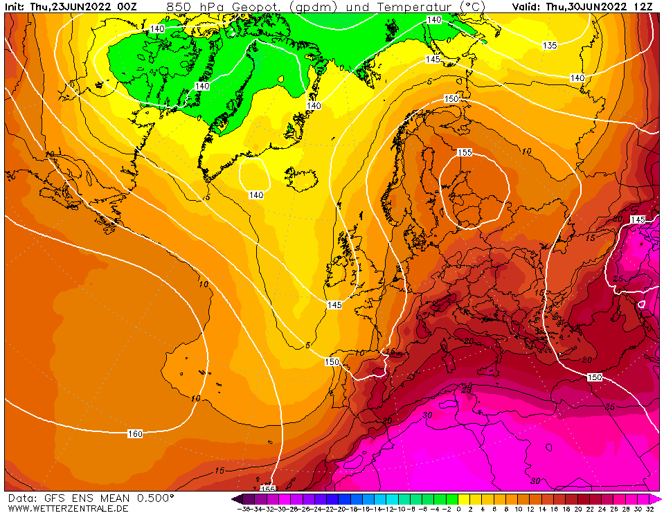 Rund um den Siebenschläfer-Tag am kommenden Montag baut sich eine Omega-Wetterlage auf. Ein kräftiges Skandinavienhoch mit leicht östlicher Verlagerung macht sich breit und zieht die ganze heiße Luft aus dem nordafrikanischen Raum mit in Richtung Mittelosteuropa. Wir liegen da „nur“ am Rande, sodass wir keine „Hitzewelle“ zu erwarten haben. Aber, wir sehen auch einen kleinen Knick über der iberischen Halbinsel, wo sich ein Tief mit hochreichender Kaltluft nach Süden verlagern wird, sodass auch westlich diese Warmluftstroms ein weiterer Schwall Heißluft nach Norden aufmachen kann, die dann auch für uns interessant werden würde. Diese hat dann aber nichts mit schönem Sommerwetter zu tun, sondern wird schwül und gewittrig sein.