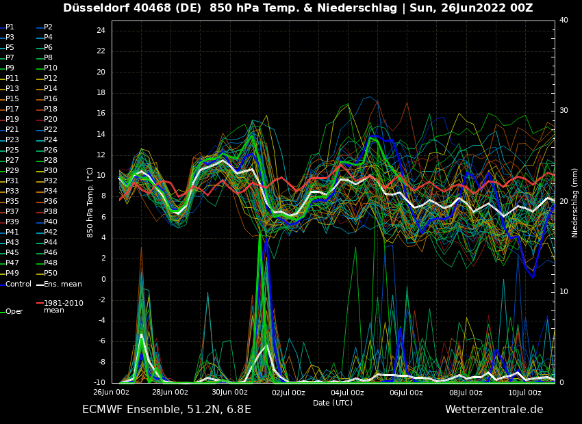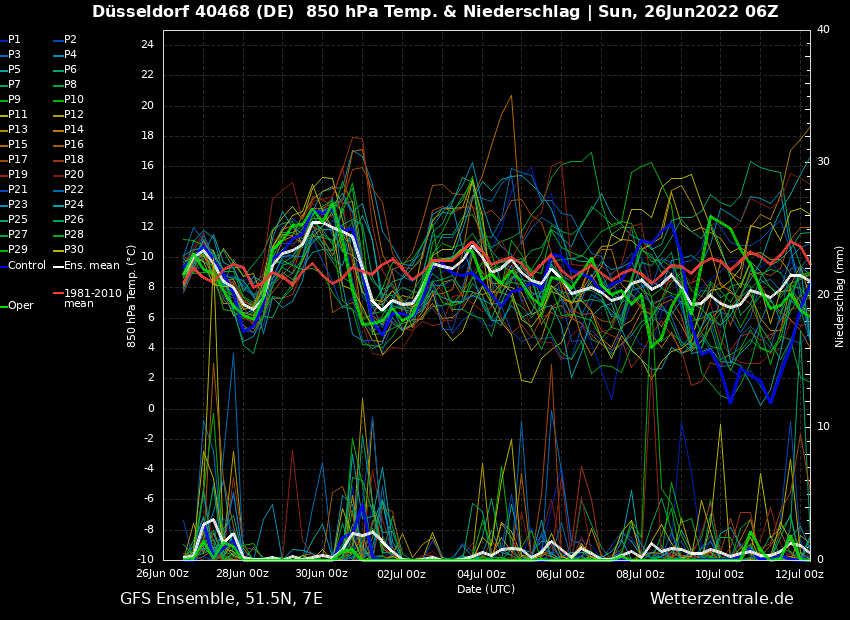 Und siehe da, nun haben wir schon zwei trockene Abschnitte im Ensemble, einmal um den 29. Juni und einmal um den 3. Juli herum. Diese sind im Vergleich auch relativ warm, wobei das gemessen am langjährigen Mittel nicht so der riesige Sprung nach oben ist. Flankiert sind diese Phasen von kühlen Wetterlagen, die uns Regen bringen. Danach bleiben wir eher unterdurchschnittlich,