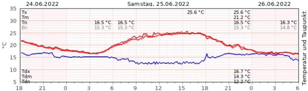 Wir lagen gestern nach wie vor im sommerlichen Bereich, auch wenn damit nun für ein paar Tage erstmal Schluss ist. Mit 21,2 °C war es gemittelt ein äußerst warmer Tag, was auch an der warmen Nacht gelegen hat. Die Höchsttemperatur von 25,6 °C hatten wir relativ früh erreicht, sodass es über einen längeren Zeitraum sommerlich warm war, was auch an den aufgezogenen Wolken im Laufe des Nachmittags lag. Der gestrige Tag war derweil 3,6 °C wärmer als die 26. Juni-Tage der vergangenen 30 Jahren.