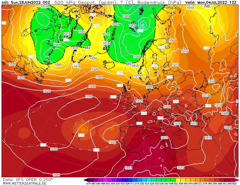 Das amerikanische Wettermodell bastelt ein bisschen an stabilem Sommerwetter. Und das alles ohne nennenswerte Schwüle und angenehmen Temperaturen. Im Laufe der kommenden Woche soll das Azoren-Hoch in Richtung Nordatlantik ausbüchsen. Der Tiefdruck über den britischen Inseln würde hingegen in Richtung Azoren wandern und somit die normale gemäßigte Großwetterlage umkehren. Die große Hitze liegt weiterhin über dem Mittelmeerraum bzw. über Osteuropa. Wirklich lange soll diese Wetterlage aber nicht bestand haben, da das Hoch einfach zu kräftig ist und sich wieder in Richtung Azoren zurückbewegen soll, zumindest laut dem Hauptlauf des GFS. Zum Vergleich: Das ECMWF hält an dem stetigen Hoch fest. Aber auch hier soll der Keil des Hochs bis nach Deutschland reinreichen.