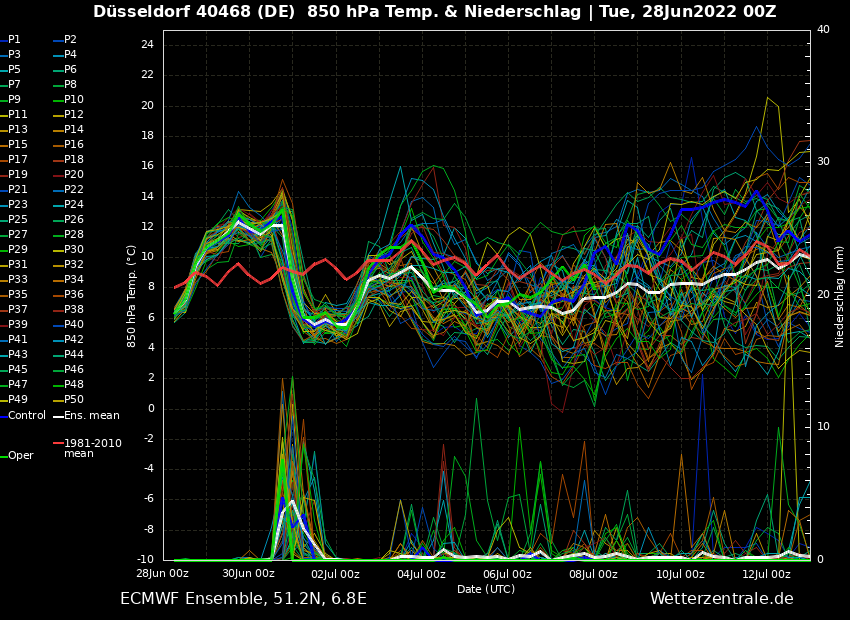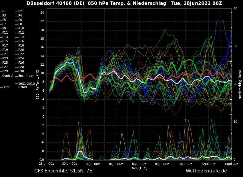 Und das sehen wir auch in den Ensembles des GFS. Die Niederschläge sind bei weitem nicht mehr so hoch wie noch die letzten Tage über berechnet, auch ist das Temperaturniveau durchaus ein höheres. Das Mittel aller Berechnung dümpelt zwar nach wie vor auf 7-8 °C in 1.500 Meter Höhe rum, aber es gibt mittlerweile wieder mehrere Modelle (u. a. der Hauptlauf), der sich in Richtung sommerliche Temperaturen um und über 25 °C bewegt. Niederschläge hingegen eher weniger.