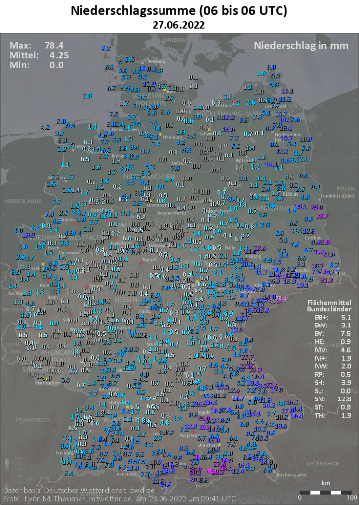 Auch heute wollen wir uns nochmal den Niederschlagssummen des gestrigen Tages widmen. Während bei uns im Westen sowohl Schauer als auch gleichmäßiger Regen (Nordwesten) unterwegs waren, gab es einmal mehr einiges an Regen an der Luftmassengrenze, die sich vom Bodensee bis nach Berlin erstreckte. Östlich davon entwickelten sich teils heftige Gewitter mit sintflutartigem Regen, wie beispielsweise in Sachsen mit bis zu 78,4 Liter pro m². Damit ist nun aber erstmal Schluss.
