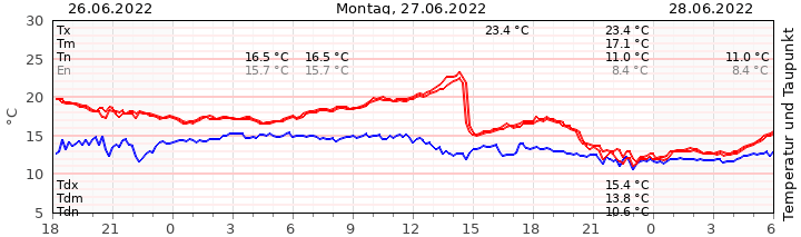 Während der gestrige Tag ziemlich ereignislos ablief mit teils schwüler Luft und viel grau am Himmel kam im Laufe des Nachmittags noch etwas Bewegung in die Wetterküche. Ein Schauer gegen 16 Uhr brachte zwar kaum Regen, dafür legte der Wind einmal kräftig zu mit einer Böe bis 69,1 km/h und einem Temperatursturz von gut 8 °C. Danach klarte der Himmel mehr und mehr auf. Mit 23,4 °C war die Höchsttemperatur unmittelbar vor dem kurzen Schauer erreicht, die Tagesmitteltemperatur lag bei 17,1 °C (-0,7 °C im Vergleich zu den 27. Juni-Tagen der vergangenen 30 Jahre).