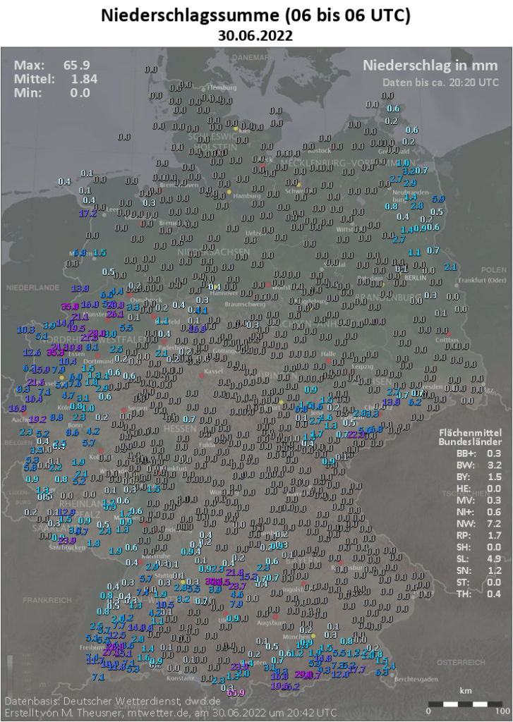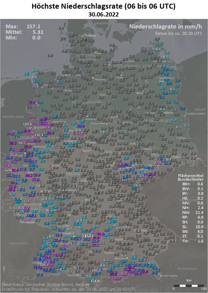 Mit 35,3 Liter pro m² hat zumindest Duisburg mal die vorläufige Führung übernommen, was den höchsten Tagesniederschlag angeht. So ein paar Kilometer machen bei solchen Wetterlagen nun mal den Unterschied im Vergleich zu unseren 7,9 Liter pro m².